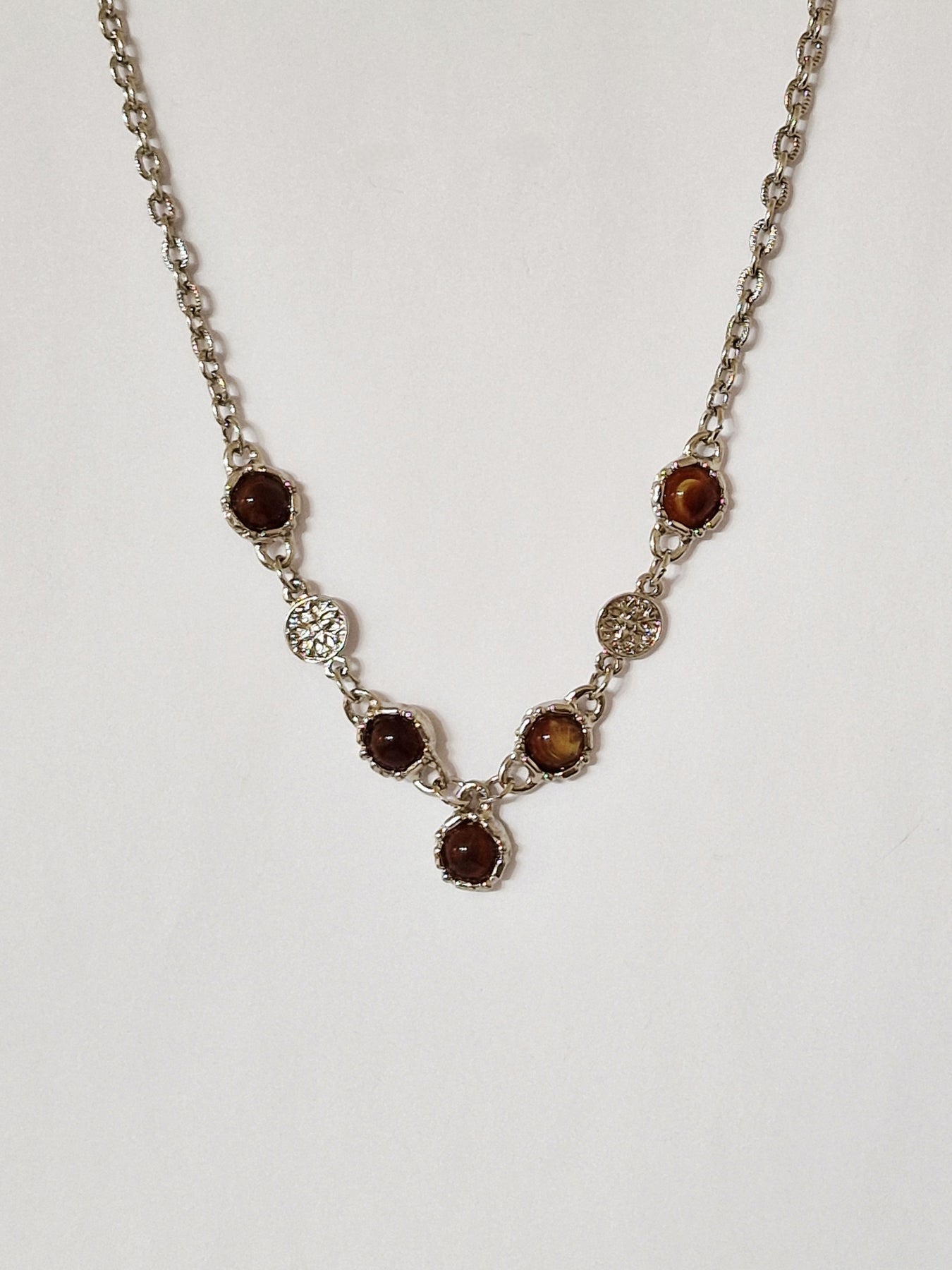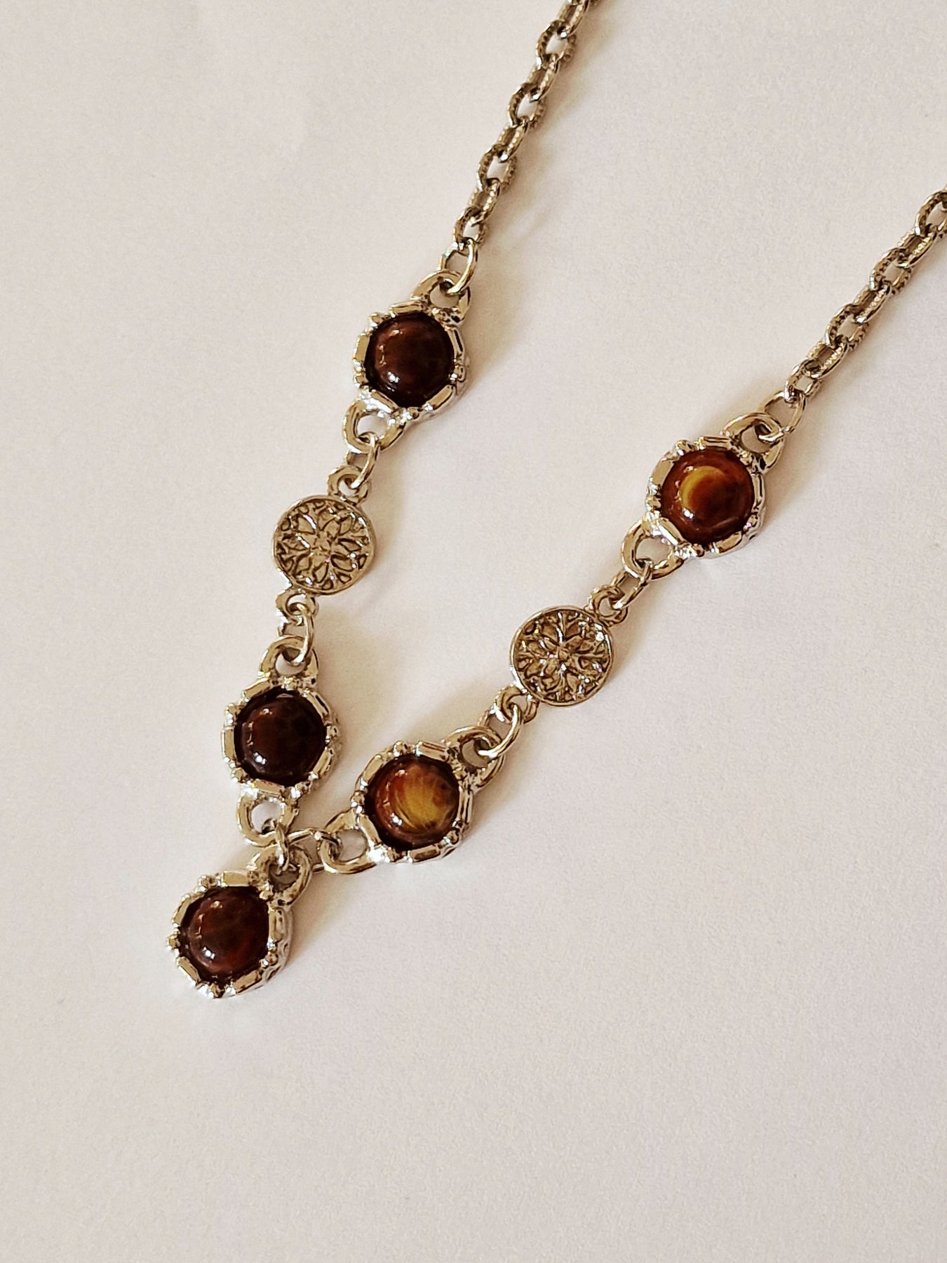 Vintage silver plated statement chain necklace with brown faux gemstones inset into charms. Deadstock, never been worn and in excellent condition. Originally by Legacy.