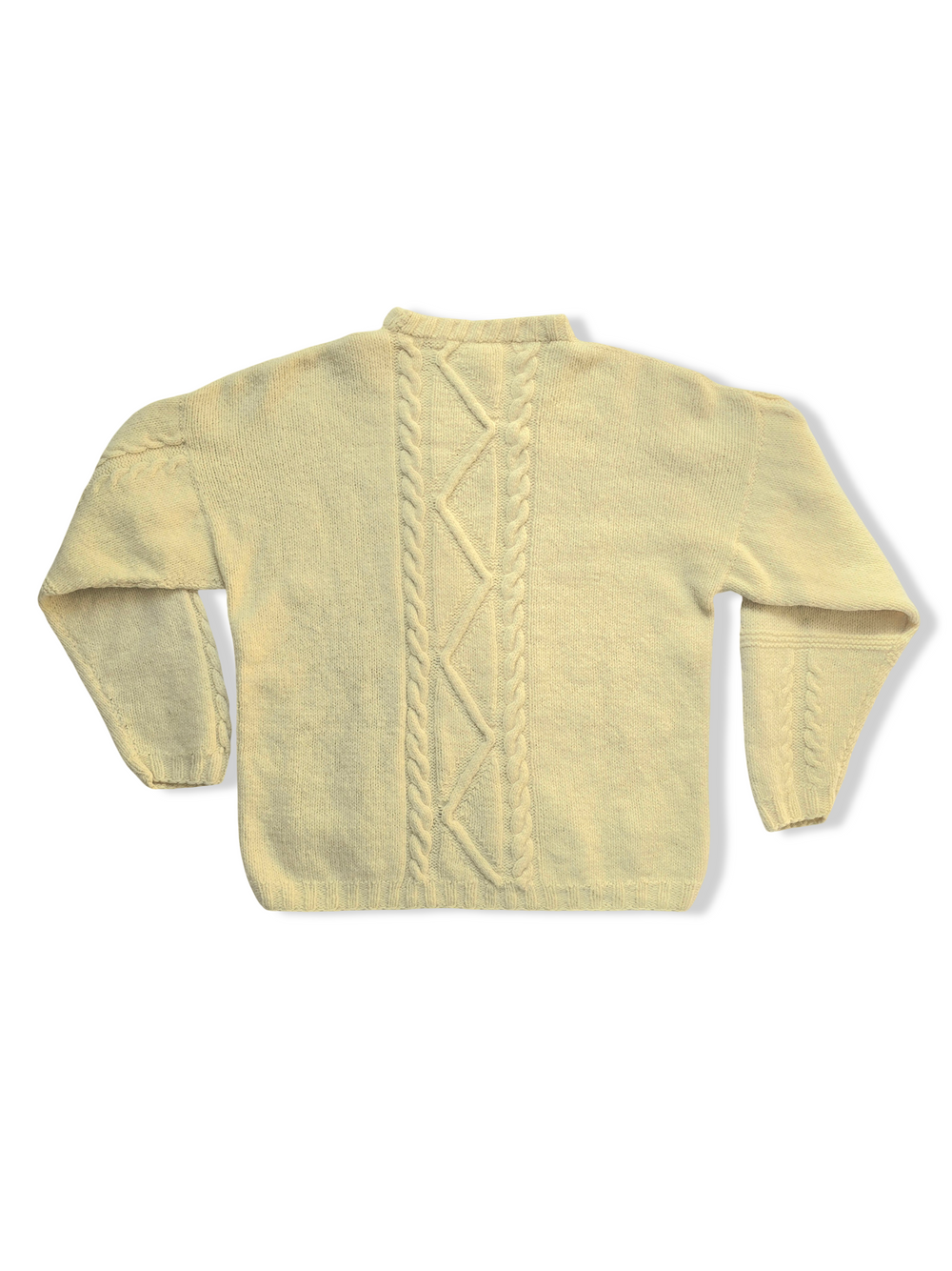 Vintage pure wool Aran style cable knit jumper in a classic cream colour. Features long sleeves and a crew neckline. The jumper is densely knit so it is very warm and comfortable. An easy to style, timeless piece for your wardrobe.