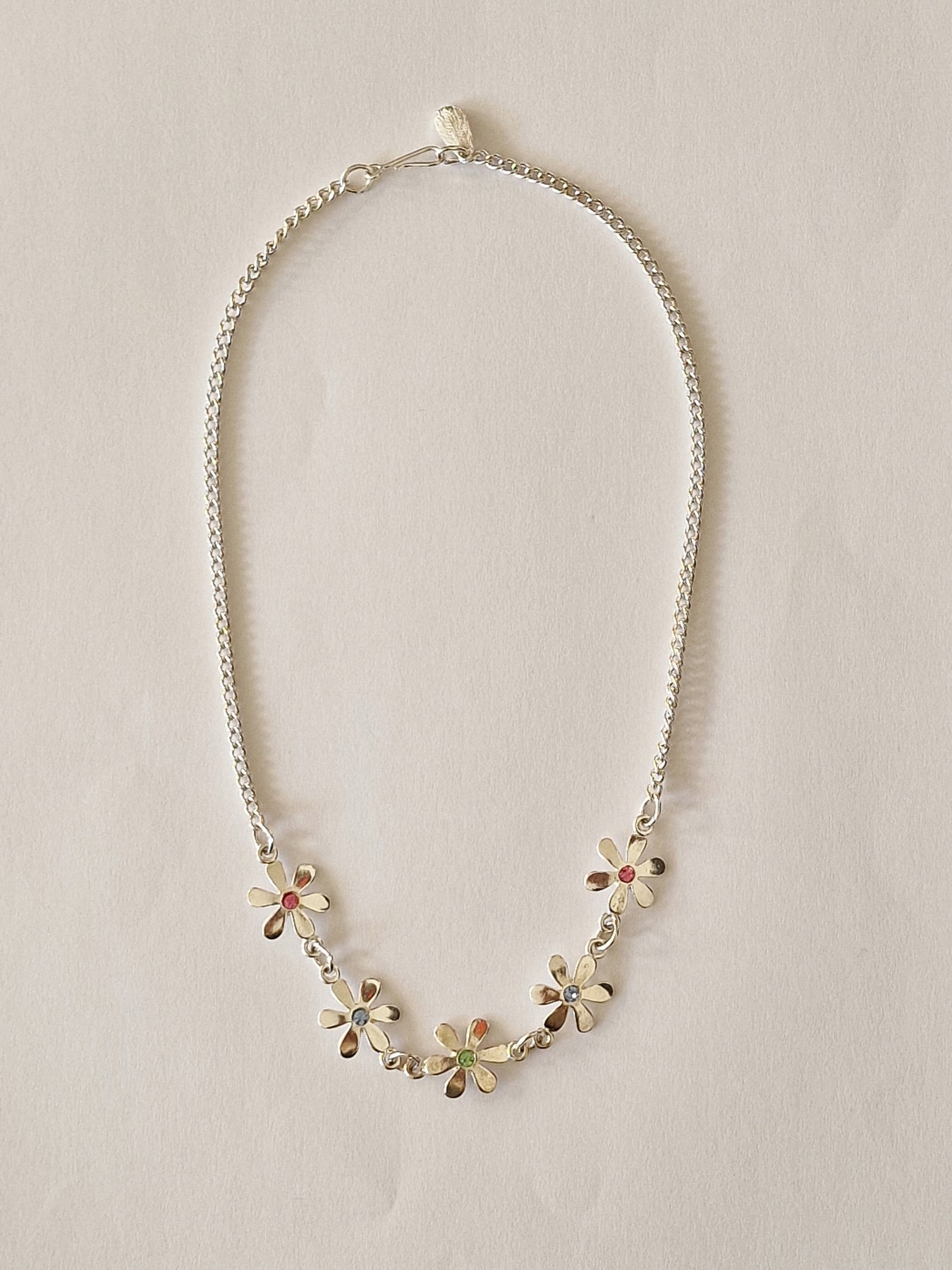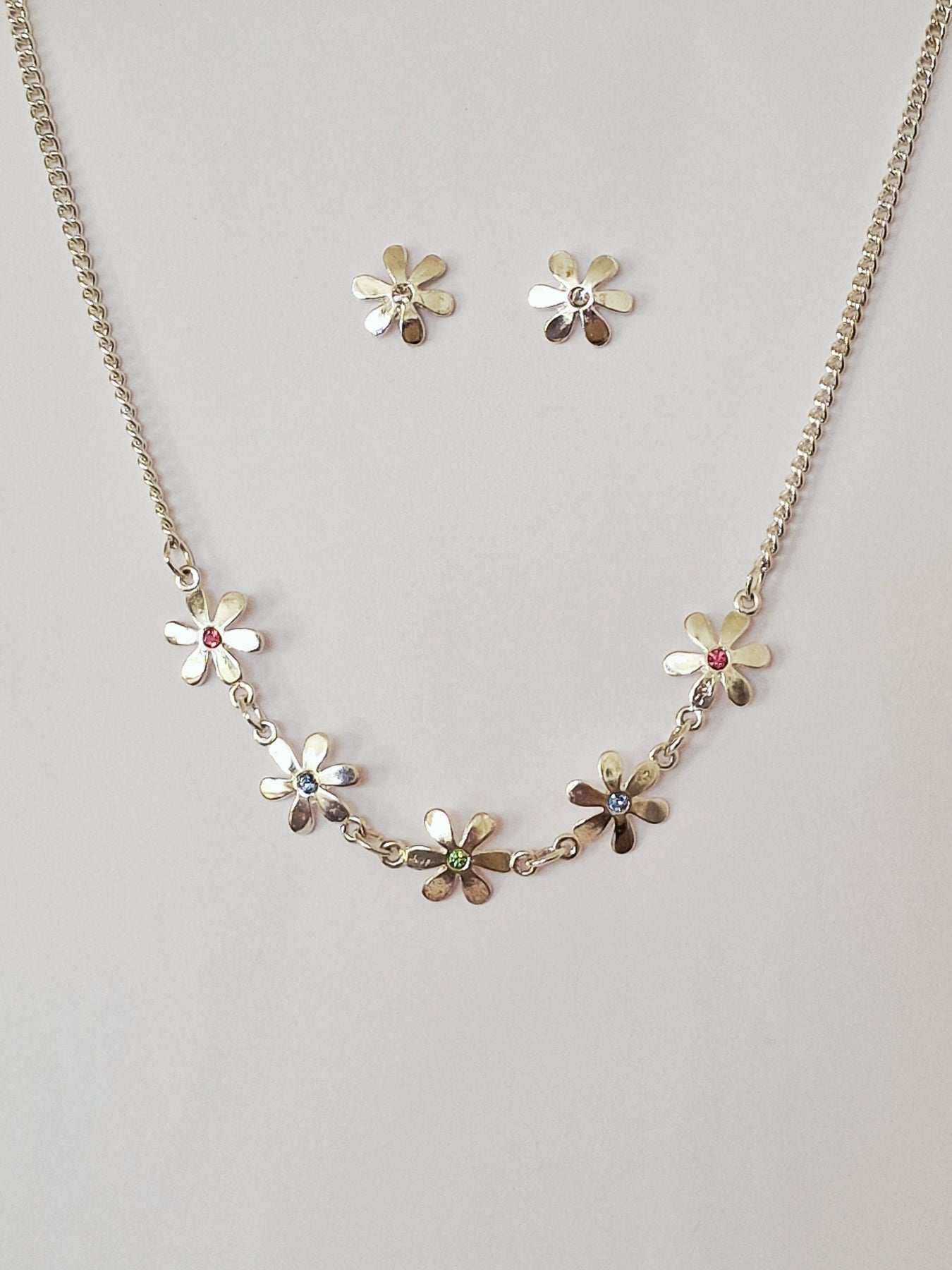 Vintage silver plated chain necklace with flowers with colourful crystal inlays and flower crystal stud earrings set.