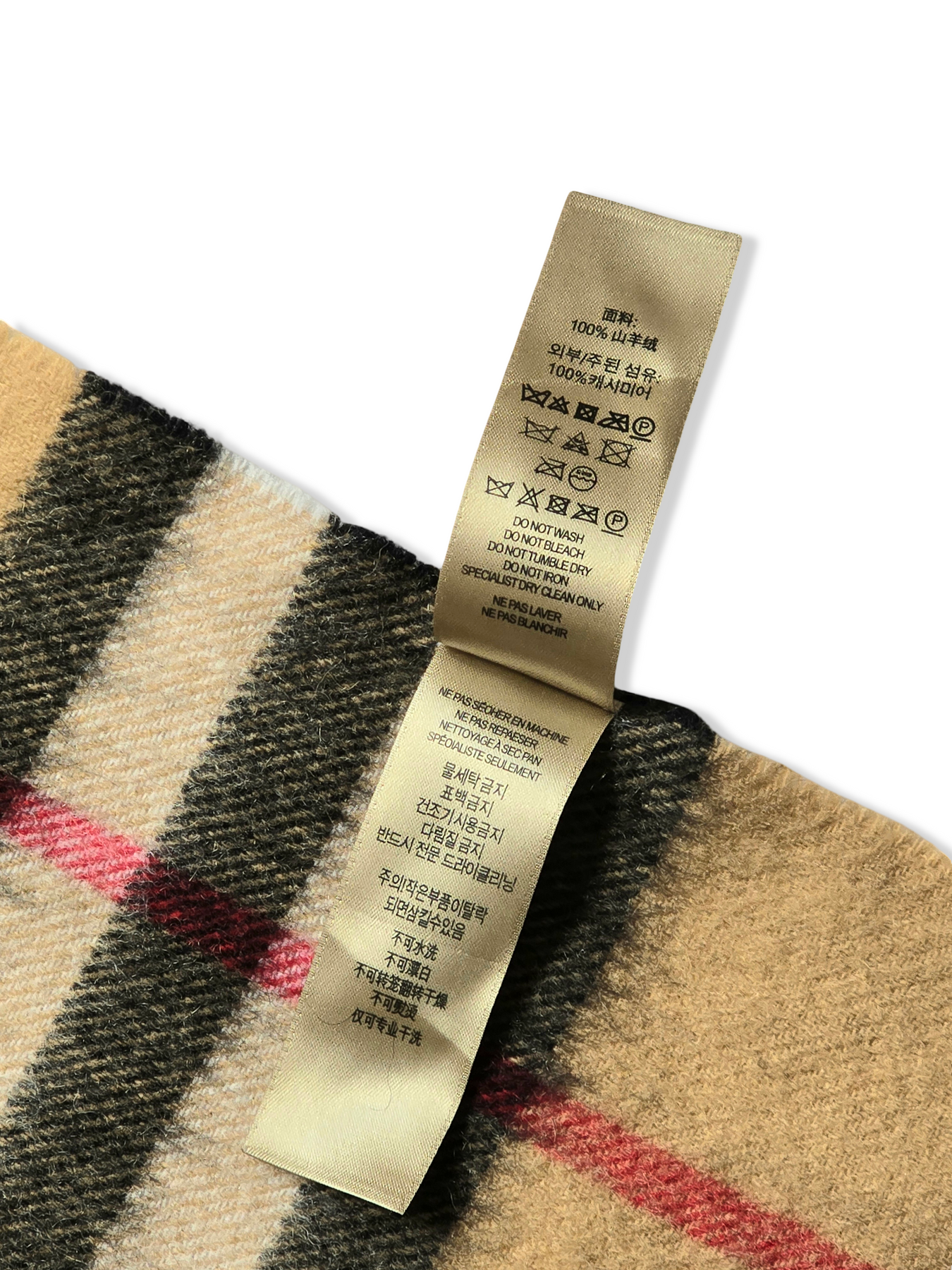 Vintage Burberry cashmere scarf in their iconic beige, red and black with tassels. Made in Scotland. Can be worn wrapped around the neck or knotted. In excellent condition.
