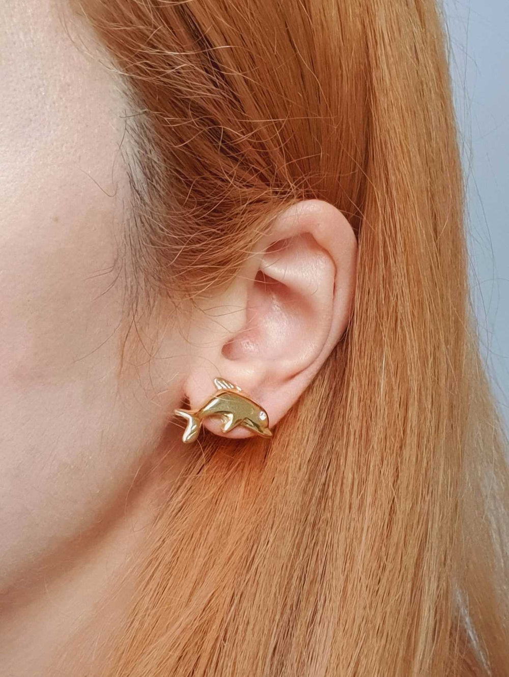 Vintage gold plated dolphin stud earrings with small crystal detail.