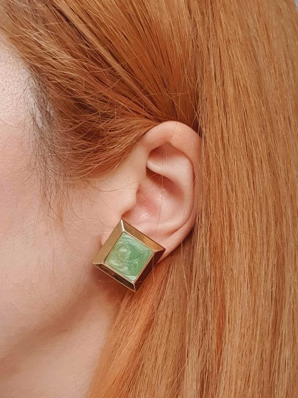 Vintage gold plated 1980s square stud earrings, filled with green enamel.