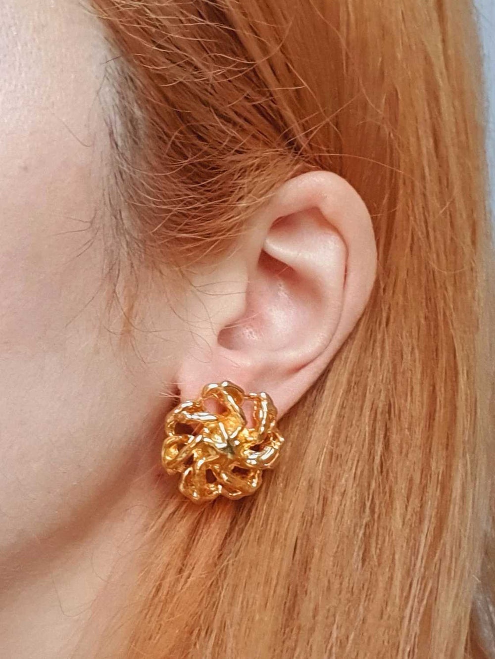 Vintage gold plated 1980s statement stud earrings with abstract flower design.