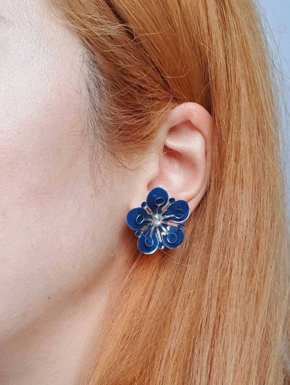 Vintage silver toned stud earrings in a gorgeous blue enamel flower design.