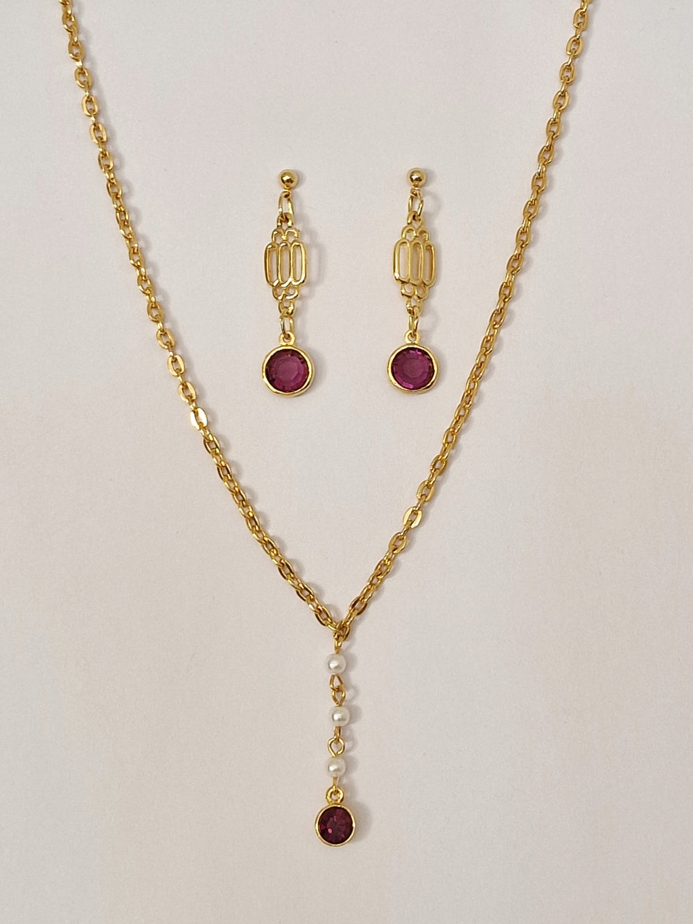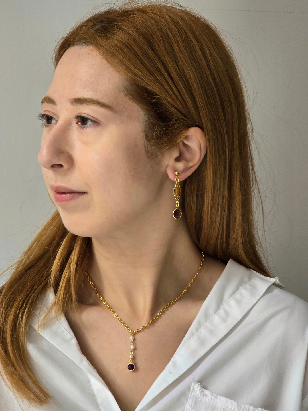 Vintage Gold Plated Purple Crystal Charm Necklace and Earring Set