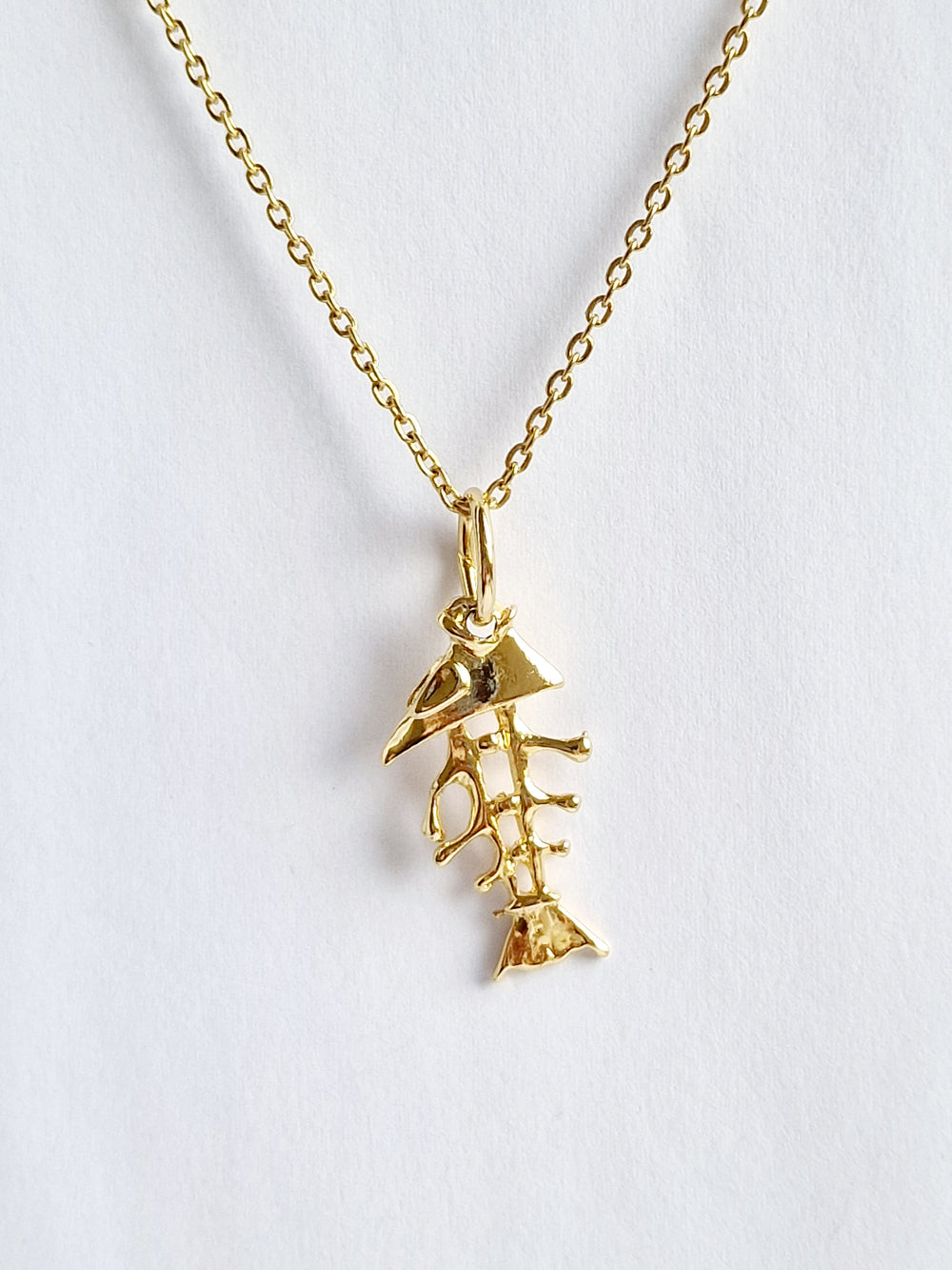 Vintage gold plated dainty chain pendant necklace with a fishbone charm.