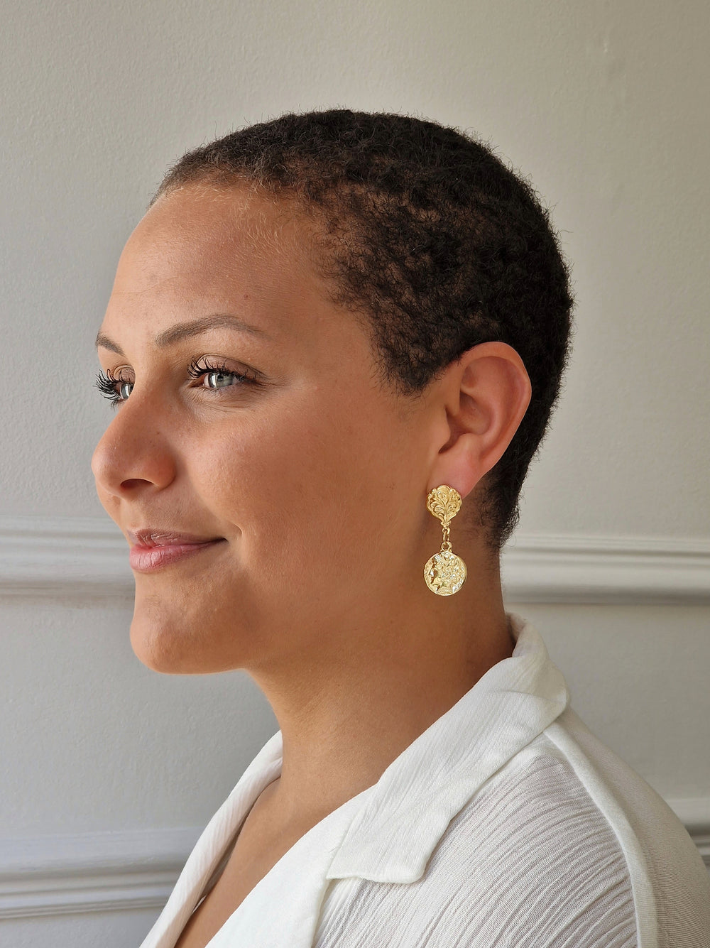 Vintage gold plated ornate, ancient greek coin style drop earrings.