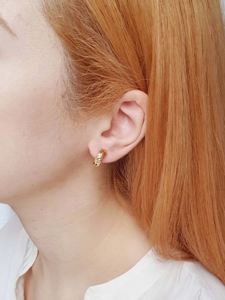 Vintage gold plated micro hoop earrings. Minimal design with subtle geometric pattern.
