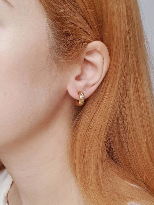 Vintage gold plated micro hoop earrings. Minimal design with subtle braided pattern.